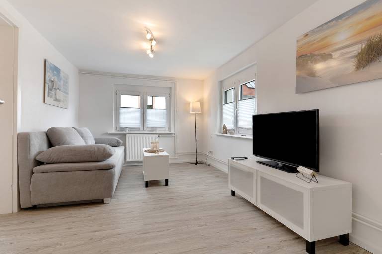Innenbereich:4-Zimmer-Wohnung 112 m², im erhöhten Erdgeschoss. Hell, einfach eingerichtet: Wohn-/Schlafzimmer mit 1 Doppeldiwanbett, Essecke, Kabel-TV und DVD. Ausgang zum Balkon, zur Terras ... mehr »